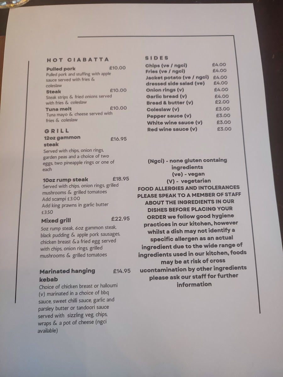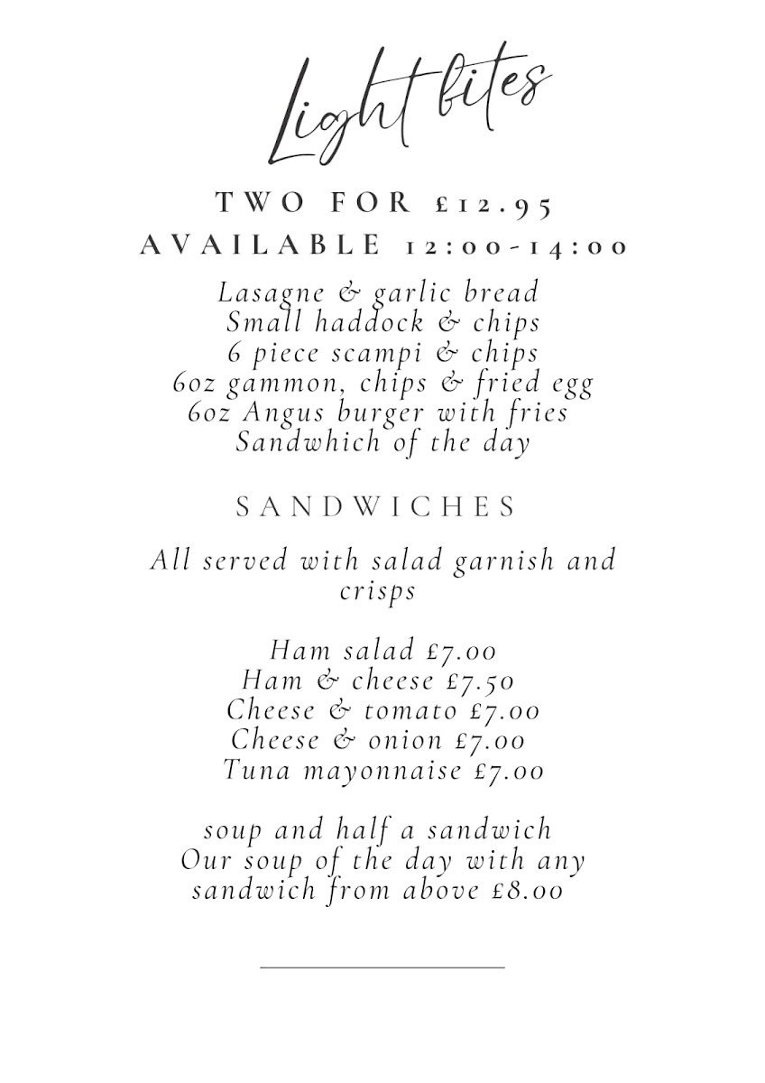 Typical highlights include traditional Sunday Lunch fare like Roast Beef Dinner and Bangers N Mash, alongside timeless pub favourites such as the Chicken Burger, Mixed Grill Platter, and Scampi. Lighter accompaniments like Garlic Mushrooms and Cauliflower Cheese complement the mains, adding familiar, satisfying flavours.